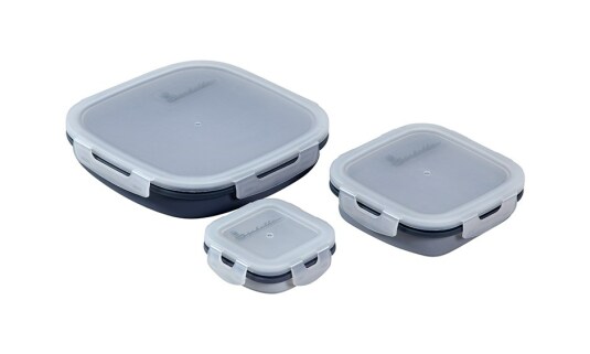 Faltbare lunchboxen Clevere zusammenklappbare Lunchboxen, die im zusammengefalteten Zustand ganz wenig Platz brauchen – und umgekehrt bei Gebrauch wahre Raumwunder sind. Die Lunchboxen sind ideal für unterwegs oder zum Aufbewahren von Speiseresten. Sie bestehen aus Silikon mit Kunststoffdeckel und sind leicht zu reinigen. Set à 3 Stck. Maße?: ?? 900060504